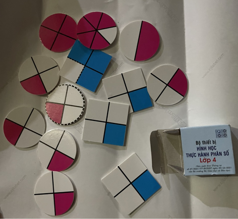 | Bộ thiết bị hình học dạy học phân số gồm: - 09 hình tròn đường kính Φ40mm, độ dày của vật liệu tối thiểu là 1,2mm màu sáng (trong đó có 5 hình được chia thành 4 phần đều nhau qua tâm bằng nét kẻ rộng 1mm; sơn màu đỏ 1/4 hình; 1 hình được chia thành 4 phần đều nhau qua tâm bằng nét kẻ rộng 1mm, đường viền theo chu vi và đường kẻ chia (không tiếp xúc với phần sơn) là nét kẻ đứt rộng 1mm, sơn đỏ 1/4; 1 hình được chia thành 4 phần đều nhau qua tâm bằng nét kẻ rộng 1mm toàn bộ hình tròn sơn màu đỏ; 1 hình được chia thành 2 phần đều nhau qua tâm bằng nét kẻ rộng 1mm; sơn đỏ 1/2 hình; 1 hình được chia thành 6 phần đều nhau qua tâm bằng nét kẻ rộng 1mm, sơn đỏ 5/6 hình tròn; - 04 hình vuông có kích thước (40x40)mm, màu trắng (trong đó có 3 hình chia thành 4 hình vuông nhỏ đều nhau qua tâm, bằng nét kẻ rộng 1mm, 1/4 hình có màu xanh cô ban và 1 bình chia thành 4 hình vuông nhỏ đều nhau qua tâm, bằng nét kẻ rộng 1mm, riêng phần không màu là nét kẻ đứt, 3/4 hình có màu xanh cô ban), độ dày của vật liệu tối thiểu là 1,2mm. |