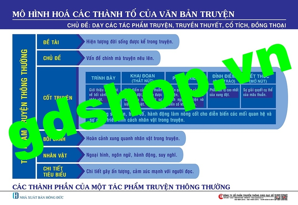 Bộ tranh mô hình hóa các thành tố của văn bản truyện: mô hình cốt truyện và các thành tố của truyện đề tài, chủ đề, chi tiết, nhân vật); mô hình đặc điểm nhân vật (hình dáng, cử chỉ, hành động, ngôn ngữ, ý nghĩ); mô hình lời người kể chuyện (kể theo ngôi thứ nhất và kể theo ngôi thứ ba) và lời nhân vật Bộ tranh gồm 03 tờ: - 01 tranh vẽ các thành phần của một cốt truyện thông thường; - 01 tranh vẽ mô hình đặc điểm nhân vật (hình dáng, cử chỉ, hành động, ngôn ngữ, ý nghĩ); - 01 tranh minh họa ngôi kể thứ nhất và ngôi kể thứ 3; lời nhân vật và lời người kể chuyện. kích thước (540x790) mm