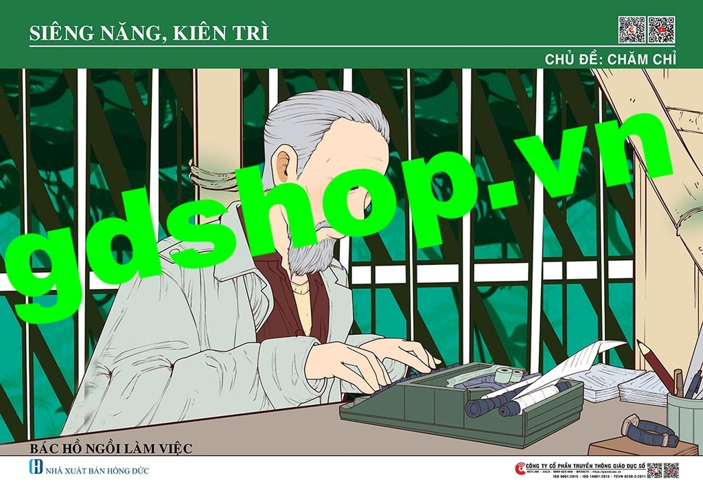 Bộ tranh gồm 02 tờ. Minh họa: - Một người đang siêng năng làm việc, đối nghịch là 1 người lười nhác nhưng mơ tưởng đến cuộc sống tốt đẹp; - Hình ảnh Bác Hồ đang ngồi làm việc trên máy chữ hoặc đang viết Kích thước (720x1020) mm