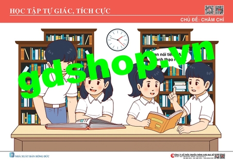 Tranh gồm 01 tờ. Nội dung thể hiện: HS tự giác, tích cực học tập: đọc sách ở thư viện, quyết tâm nói tiếng Anh thành thạo. Kích thước (720x1020) mm